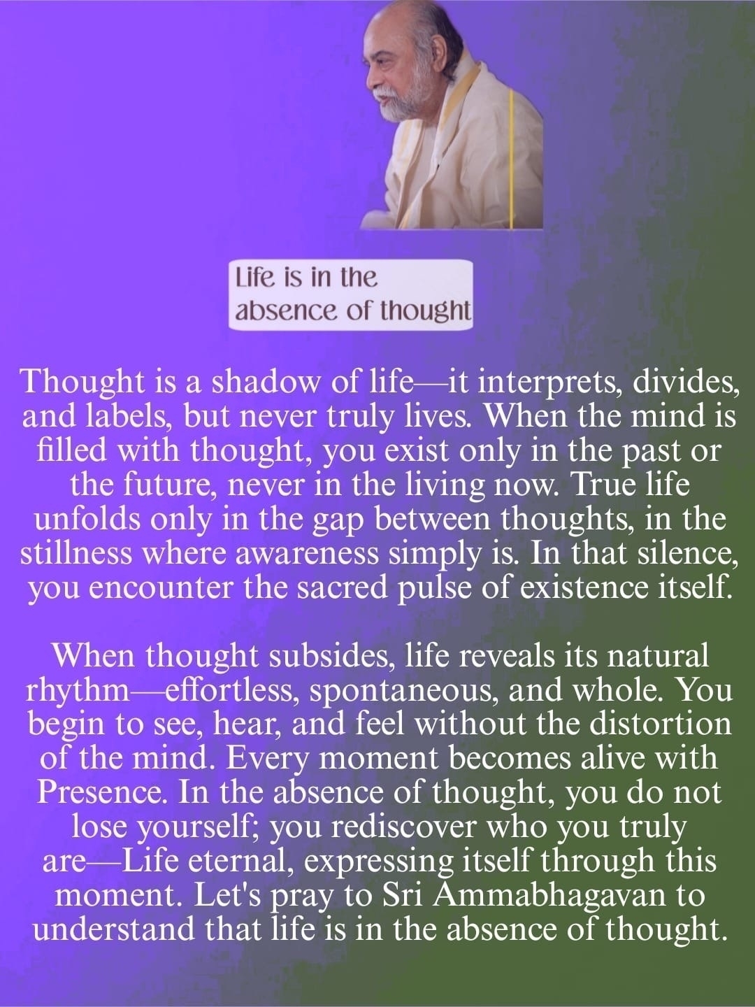 When thought subsides, life reveals its natural rhythm-effortless, spontaneous, and whole. You begin to see, hear, and feel without the distortion of the mind. Every moment becomes alive with Presence. In the absence of thought, you do not lose yourself; you rediscover who you truly are-Life eternal, expressing itself through this moment. Let’s pray to Sri Ammabhagavan to understand that life is in the absence of thought.