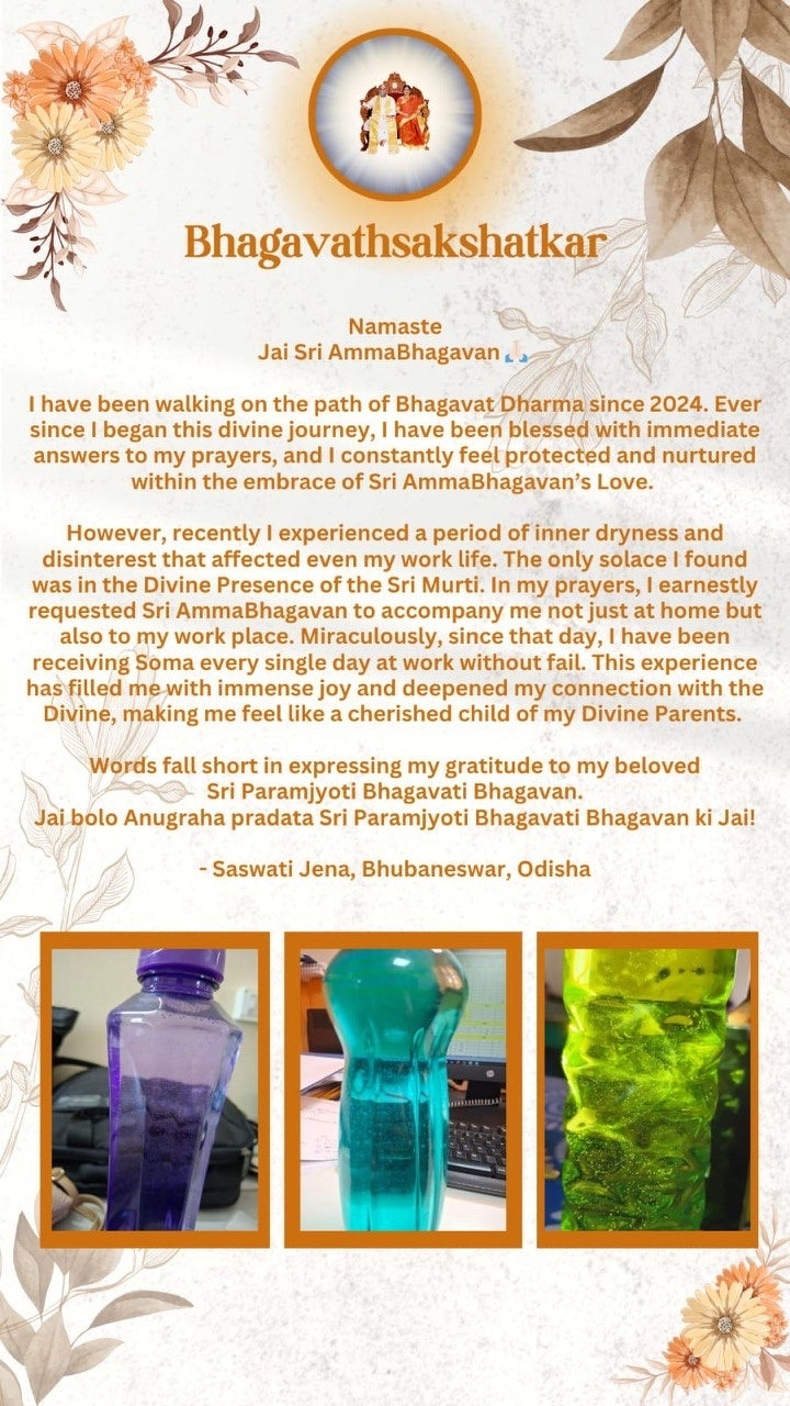 However, recently I experienced a period of inner dryness and disinterest that affected even my work life. The only solace I found was in the Divine Presence of the Sri Murti. In my prayers, I earnestly requested Sri AmmaBhagavan to accompany me not just at home but also to my work place. Miraculously, since that day, I have been receiving Soma every single day at work without fail. This experience has filled me with immense joy and deepened my connection with the Divine, making me feel like a cherished child of my Divine Parents.