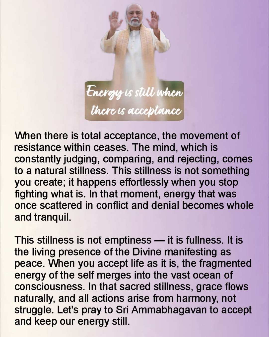 it is fullness. It is This stillness is not emptiness the living presence of the Divine manifesting as peace. When you accept life as it is, the fragmented energy of the self merges into the vast ocean of consciousness. In that sacred stillness, grace flows naturally, and all actions arise from harmony, not struggle. Let’s pray to Sri Ammabhagavan to accept and keep our energy still.