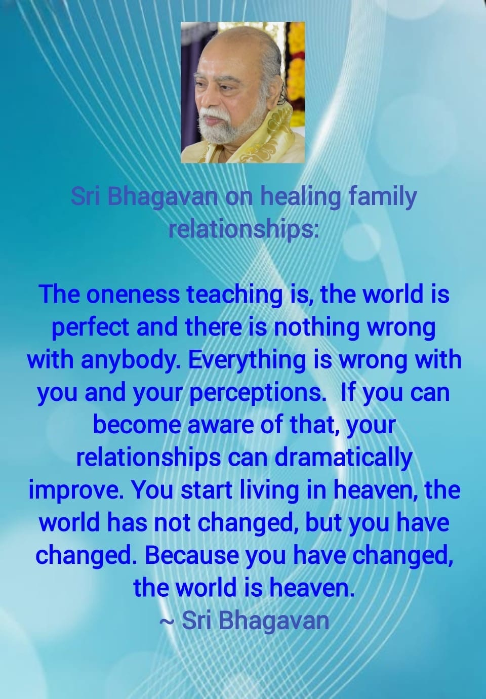 The oneness teaching is, the world is perfect and there is nothing wrong with anybody. Everything is wrong with you and your perceptions. If you can become aware of that, your relationships can dramatically improve. You start living in heaven, the world has not changed, but you have changed. Because you have changed, the world is heaven.