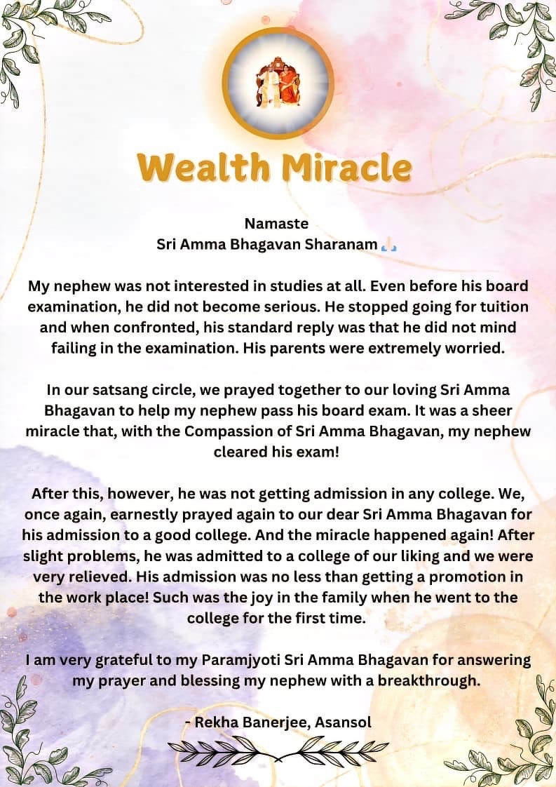 In our satsang circle, we prayed together to our loving Sri Amma Bhagavan to help my nephew pass his board exam. It was a sheer miracle that, with the Compassion of Sri Amma Bhagavan, my nephew cleared his exam!
