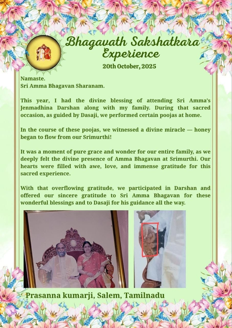 This year, I had the divine blessing of attending Sri Amma’s Jenmadhina Darshan along with my family. During that sacred occasion, as guided by Dasaji, we performed certain poojas at home.