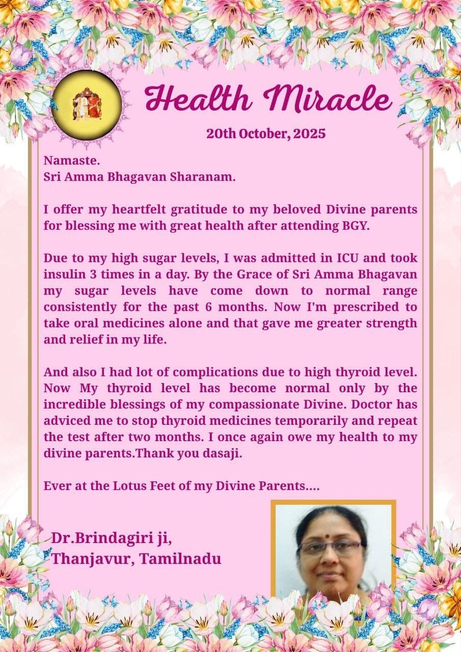 Due to my high sugar levels, I was admitted in ICU and took insulin 3 times in a day. By the Grace of Sri Amma Bhagavan my sugar levels have come down to normal range consistently for the past 6 months. Now I’m prescribed to take oral medicines alone and that gave me greater strength and relief in my life.