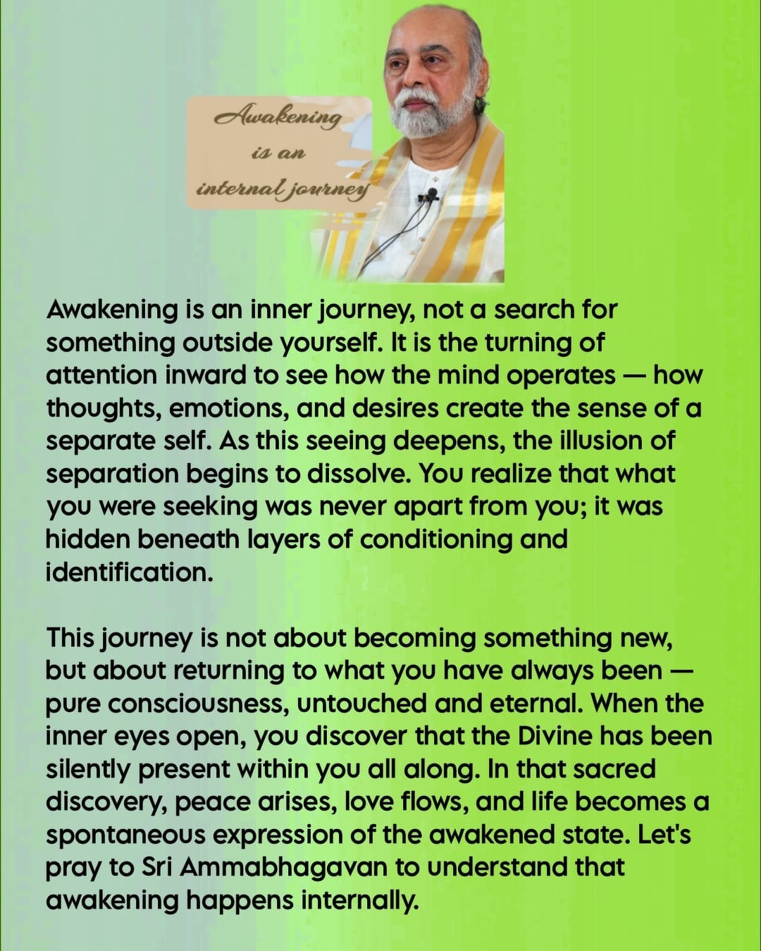 This journey is not about becoming something new, but about returning to what you have always been pure consciousness, untouched and eternal. When the inner eyes open, you discover that the Divine has been silently present within you all along. In that sacred discovery, peace arises, love flows, and life becomes a spontaneous expression of the awakened state. Let’s pray to Sri Ammabhagavan to understand that awakening happens internally.
