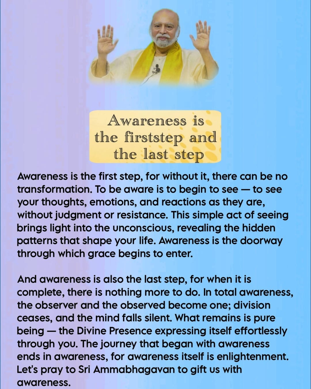 Awareness is the firststep and the last step Awareness is the first step, for without it, there can be no transformation. To be aware is to begin to see — to see your thoughts, emotions, and reactions as they are, without judgment or resistance. This simple act of seeing brings light into the unconscious, revealing the hidden patterns that shape your life. Awareness is the doorway through which grace begins to enter. And awareness is also the last step, for when it is complete, there is nothing more to do. In total awareness, the observer and the observed become one; division ceases, and the mind falls silent. What remains is pure being - the Divine Presence expressing itself effortlessly through you. The journey that began with awareness ends in awareness, for awareness itself is enlightenment. Let’s pray to Sri Ammabhagavan to gift us with awareness.