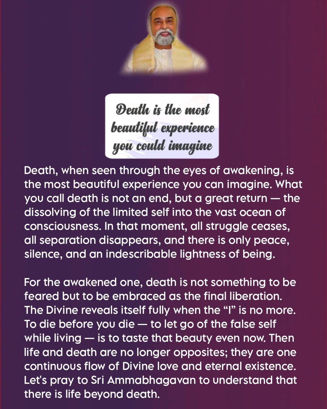 For the awakened one, death is not something to be feared but to be embraced as the final liberation. The Divine reveals itself fully when the “I” is no more. To die before you die - to let go of the false self while living - is to taste that beauty even now. Then life and death are no longer opposites; they are one continuous flow of Divine love and eternal existence. Let’s pray to Sri Ammabhagavan to understand that there is life beyond death.