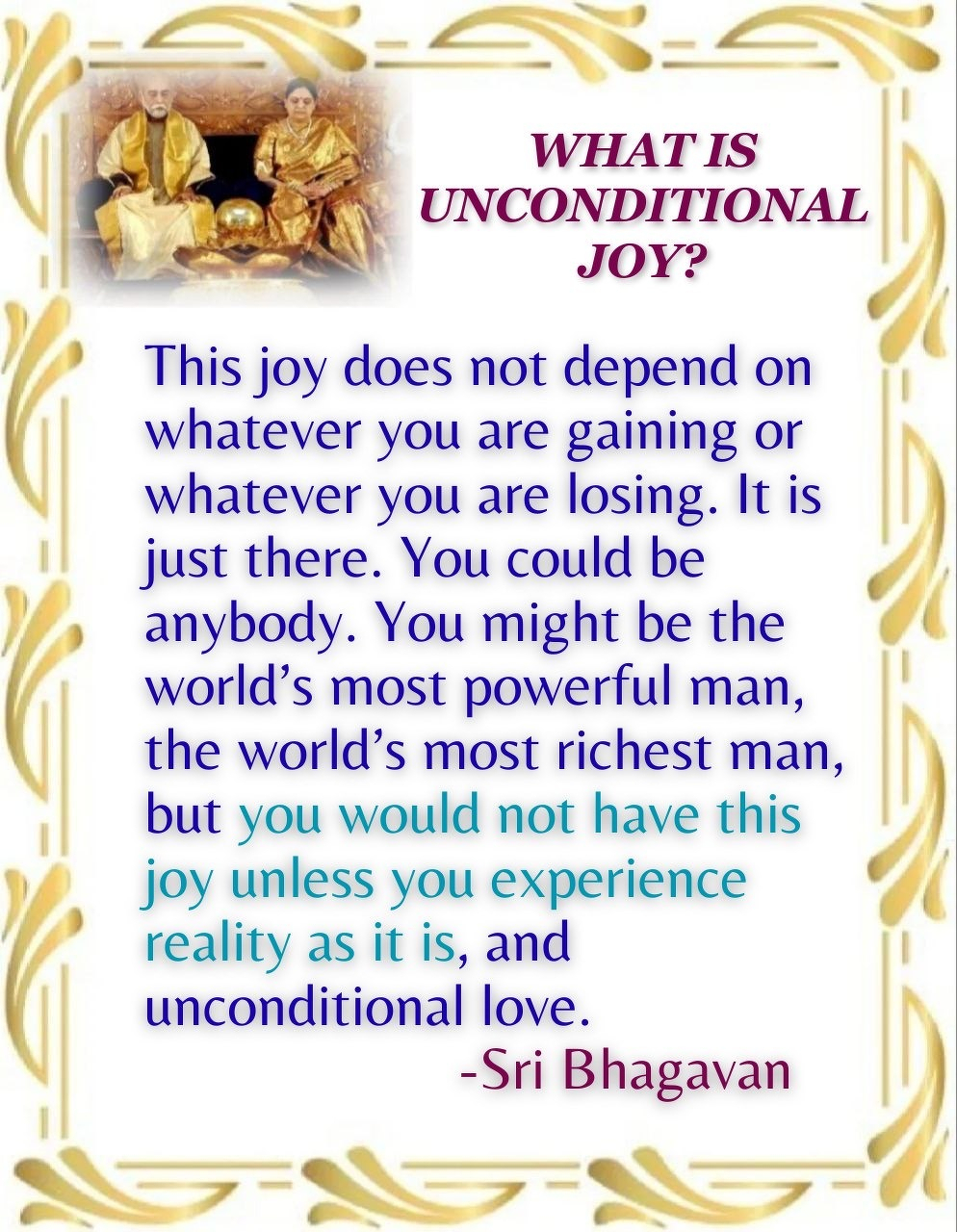 This joy does not depend on whatever you are gaining or whatever you are losing. It is just there. You could be anybody. You might be the world’s most powerful man, the world’s most richest man, but you would not have this joy unless you experience reality as it is, and unconditional love.