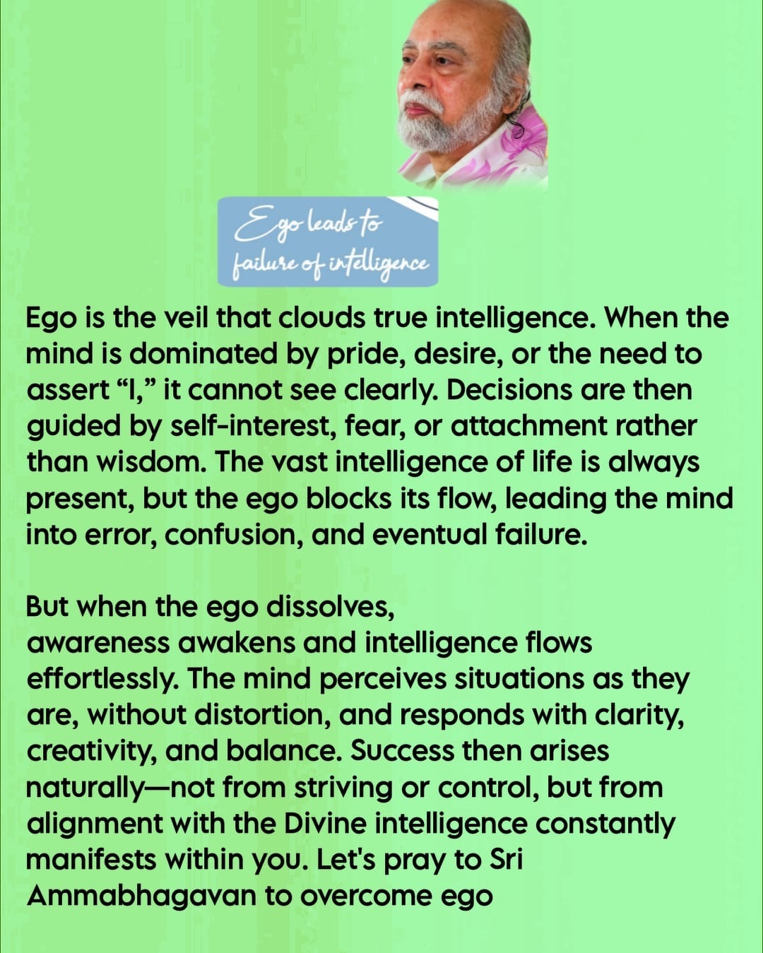But when the ego dissolves, awareness awakens and intelligence flows effortlessly. The mind perceives situations as they are, without distortion, and responds with clarity, creativity, and balance. Success then arises naturally-not from striving or control, but from alignment with the Divine intelligence constantly manifests within you. Let’s pray to Sri Ammabhagavan to overcome ego